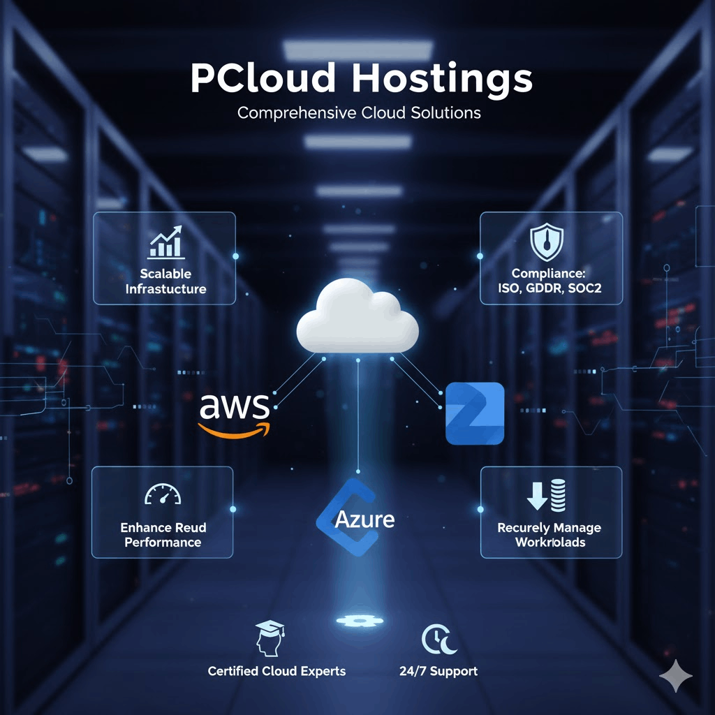 At PCloud Hostings, we provide comprehensive cloud solutions powered by AWS, Microsoft Azure, and Google Cloud Platform. Our services are designed to help businesses build scalable infrastructure, enhance performance, reduce costs, and securely manage their digital workloads. With certified cloud experts and 24/7 support, we ensure a seamless, efficient cloud journey for organizations of all sizes.