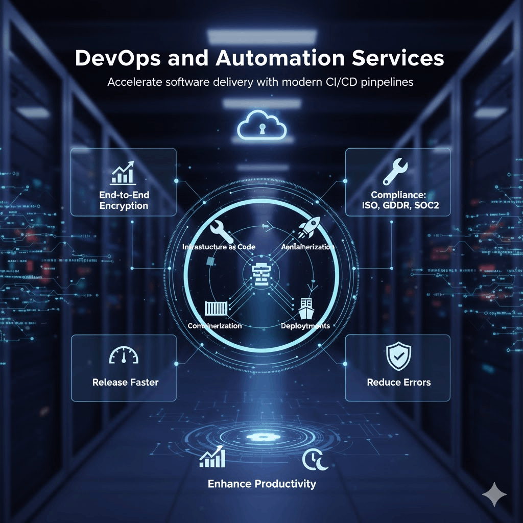 Our DevOps and Automation Services help organizations accelerate software delivery with modern CI/CD pipelines, Infrastructure as Code, containerization, and automated deployments. By integrating DevOps practices, we help teams release faster, reduce errors, and enhance productivity.
